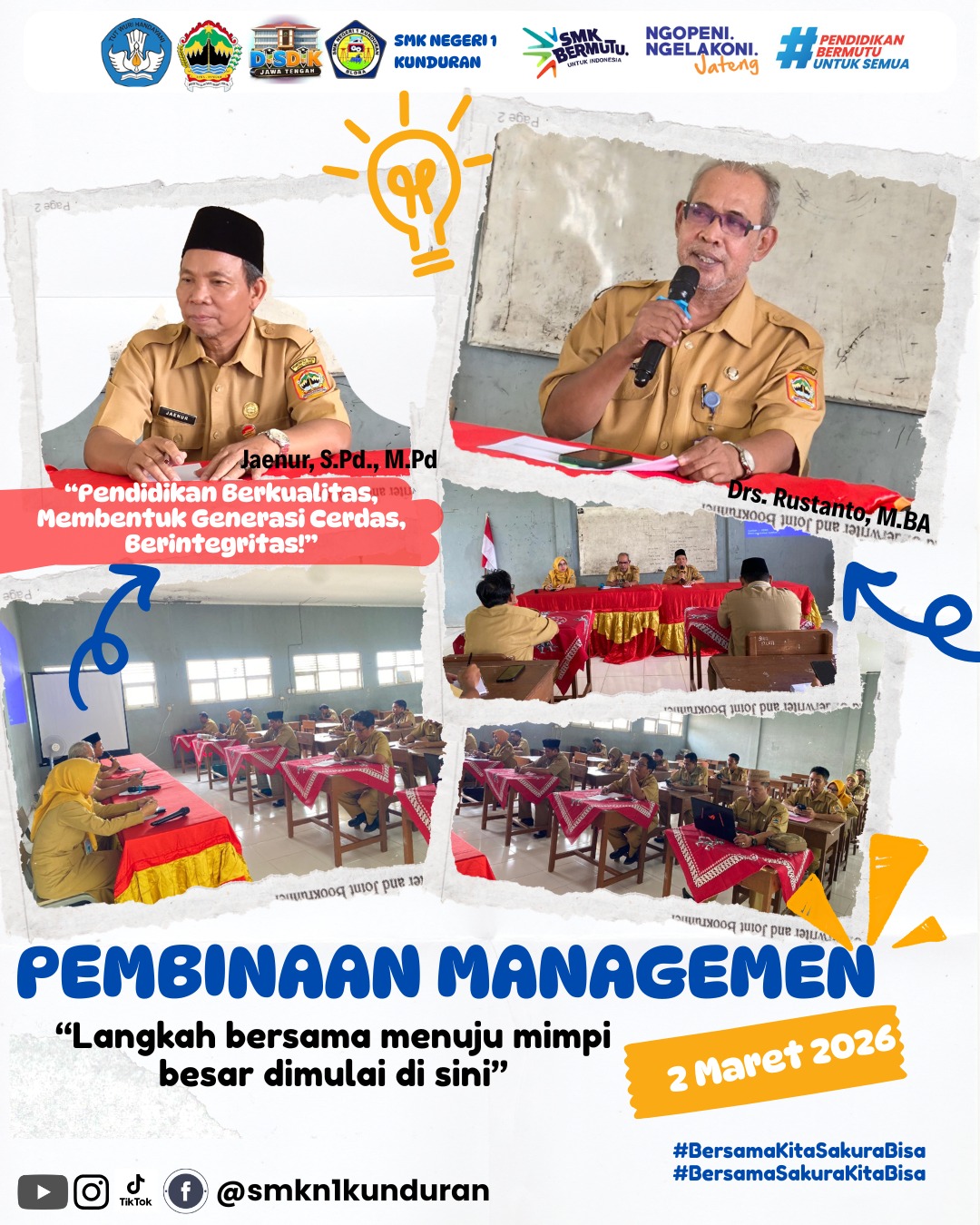 "Semoga melalui pembinaan ini, SMK Negeri 1 Kunduran semakin solid dalam melangkah, membawa kemajuan nyata, dan mampu memberikan kualitas pendidikan terbaik bagi seluruh peserta didik."